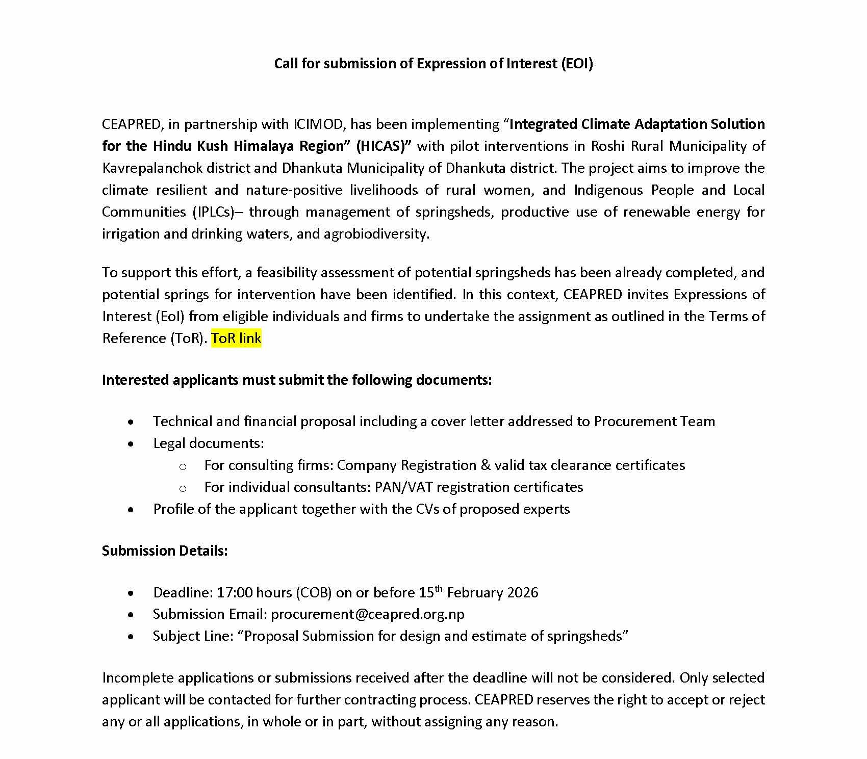 Click here for TOR: ToR for conducting springshed detail design and cost estimate