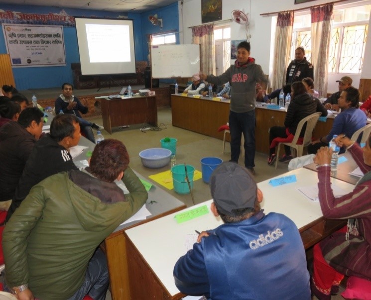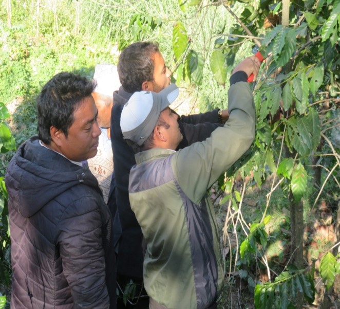 Under the Hamro Coffee project, implemented in partnership with ICCO-Cooperation and Nepal Coffee Producers Association (NCPA), the second batch of Extension Service Providers (ESPs) were trained on coffee production management. The training was organized for seven days at Chetana Kendra, Banepa Kavre for 24 participants. The practical training was organized on the coffee plantations of Bela, Kavre. The training included 20 ESPs selected by the project, five each from Kavrepalanchok, Sindhupalanchok, Nuwakot and Lalitpur and four ESPs supported by private entrepreneurs. Thus, a total of 24 ESPs were trained for seven days on various aspects of coffee orchard management and its production/processing aspects. The training was mainly focused on orchard management, disease management, primary processing, marketing, supply chain and marketing opportunities. The main objective of the training was to enhance the knowledge and skills of extension service providers on coffee production management,   which will be used as frontline support for the coffee farmers.