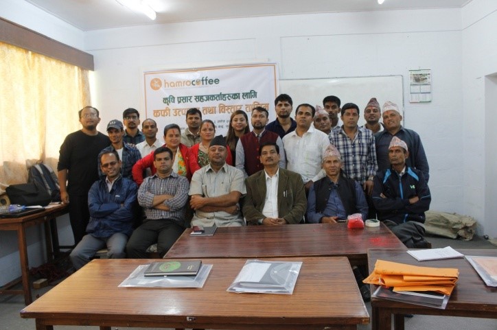 A seven days training on Coffee production and processing was organized for 10 extension service providers (ESP) from Kaski and Syangja districts of Western Nepal at Regional Agricultural Research Station, Lumle, Kaski. The training mainly focused on Orchard management, disease management, primary processing, marketing, supply chain and expansion of coffee orchards with marketing opportunities. The main objective of the training was to enhance the capacity of extension workers on coffee production by delivering required knowledge and skills for adequate and efficient service delivery in the rural areas as a frontline support to the farmers.